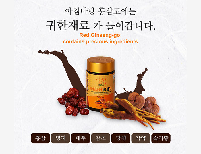 Thành phần: Chiết xuất hồng sâm (hàm lượng rắn 1%, xuất xứ Hàn Quốc) 10% Chiết xuất hồng sâm tẩm đường (hồng sâm Hàn Quốc 70%, fructose 25%, oligosacarit 5%, hàm lượng rắn 67% trở lên) 50% Chiết xuất hỗn hợp thực vật 40% Chiết xuất hỗn hợp thực vật: Trần bì (Hàn Quốc) 11%, Gừng (Trung Quốc) 11%, Địa hoàng (Trung Quốc) 11%, Ngải cứu, Bạch chỉ, Linh chi, Xà sàng, Hoàng kỳ, Táo đỏ, Cam thảo, Mẫu đơn.